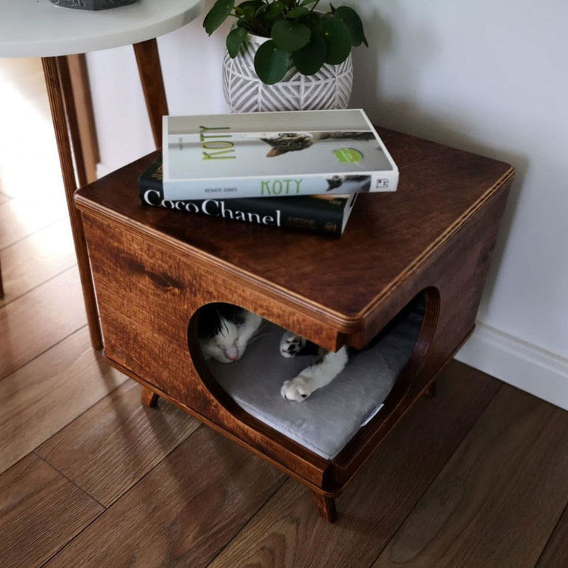 애완동물 가게 또는 애완동물 조련사 : 애완동물 가게 또는 애완 조련사는 주인을 위한 기능적 머리맡 탁자와 더불어, 고양이들을 방문하기 위한 편안하고 안전한 휴식 영역을 제공하기 위해 종종 머리맡 탁자 고양이 대피소를 제공할 것입니다.