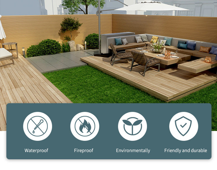 WPC 재료 : WPC 그릴 야외 나무 클래딩 패널은 목재 플라스틱 복합체 (WPC), 목재 섬유와 고품질 폴리에틸렌의 혼합 또는 폴리 프롤필렌 수지로 만들어집니다. WPC 물질은 그들을 야외 장식에 이상적이게 하는 플라스틱의 물과 내후성과 나무의 자연 문양과 구성을 결합시킵니다.